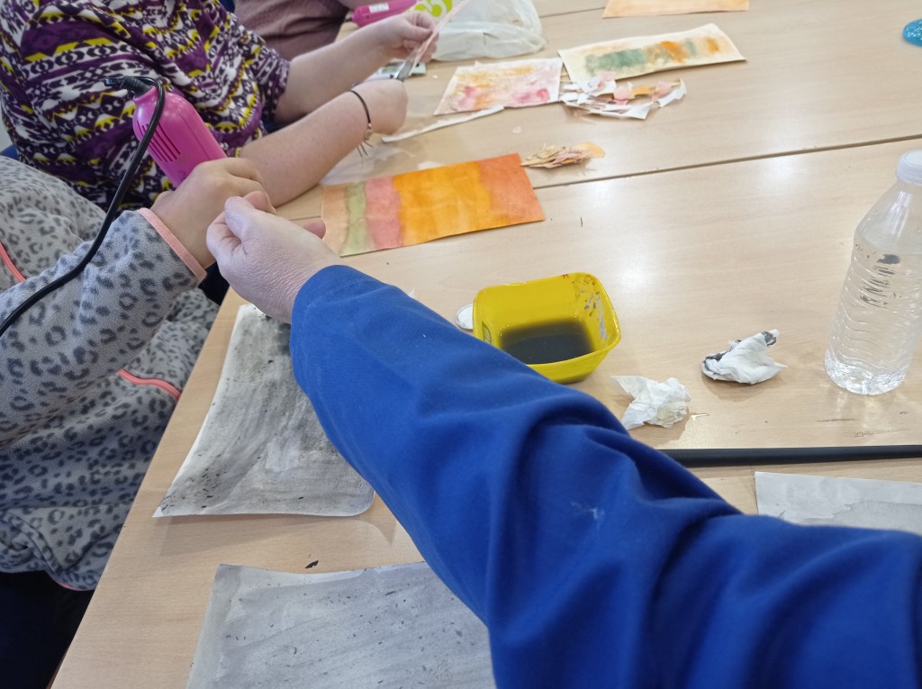 N: Hubo muchos momentos bonitos, como cuando se les propuso el taller y vi la ilusión que les causaba, o cuando me decían que ojalá el taller continuara con más historias. Pero hay uno que tengo grabado con especial cariño. Una de las usuarias estaba secando su hoja de acuarela con un secador, y otra, al ver que el secador estaba demasiado cerca de la hoja, levantó su mano con cuidado para evitar que se quemara. Lo más bonito fue que no solo lo hizo en ese momento, sino que se quedó un buen rato sosteniéndola en alto, mientras seguía trabajando.